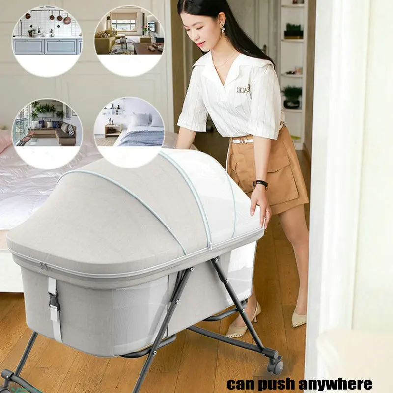 Portable Travel Bed with Mosquito Net 4 Wheeled Baby Bassinet can change to Rocking Cradle Simple N